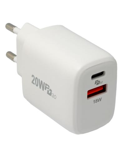Carregador de paret amb sortida USB-A i USB-C PD 3.0 (Quick Charge) Especificacions: - Entrada: 100-240V ~ 50-60Hz 0.5A - Sortides: USB-C amb PD: 5V/3A, 9V/2.25A, 12V/1.5A USB-A: 3.6-6.5V/3A, 6.5-9V/2A, 9-12V/1.5A USB-C + USB-A (en paral·lel): 5V/3.4A ambdues sortides - Color: Blanc