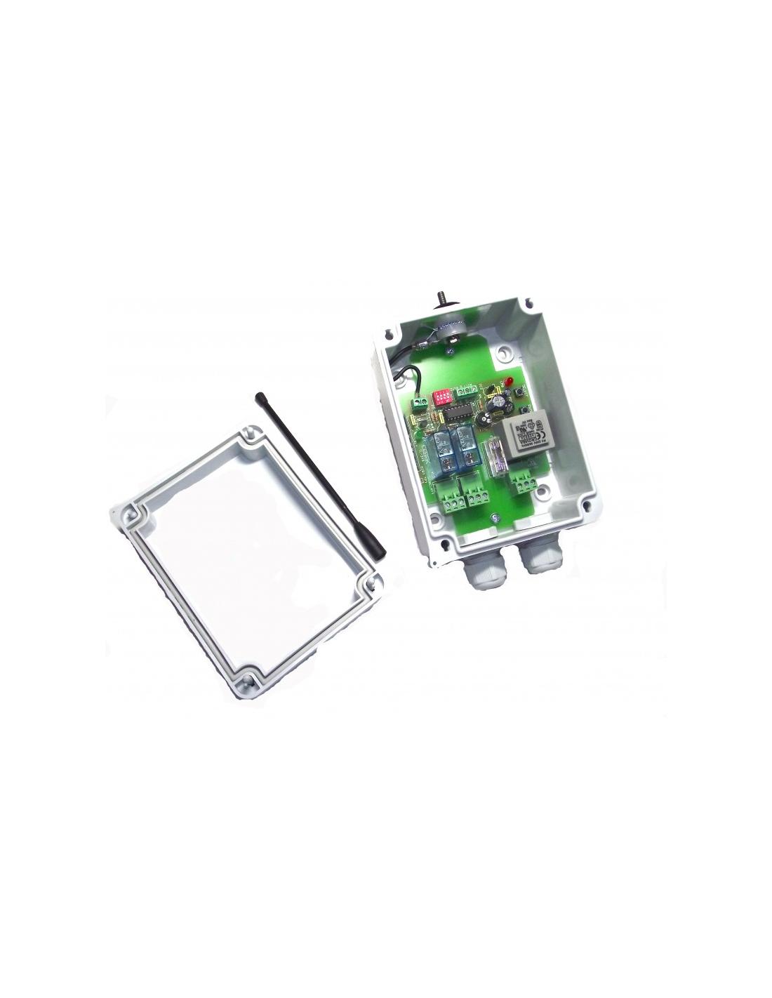Telemando receptor profesional de radiofrecuencia de 2 canales con salida a relé, a 230 V CA, con antena de 179 mm.